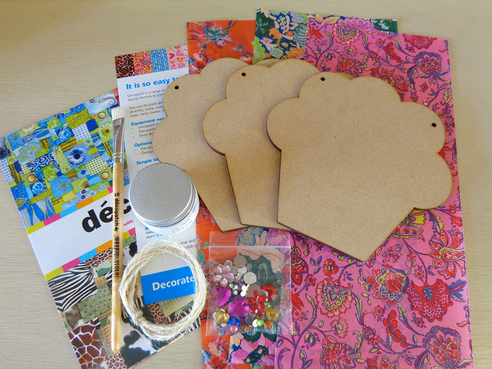 3 x 15CM cupcake shapes (MDF), a mixed pack of paper (equalling 1 full sheet), jewels, 1 x decopatch brush, a small pot of  decopatch glue and  jute for hanging.