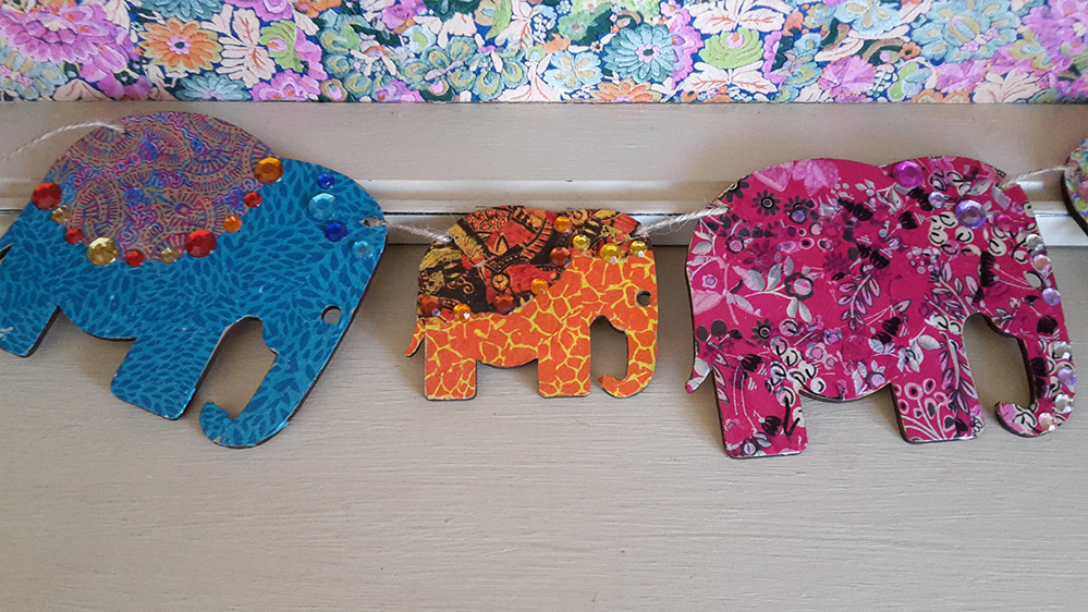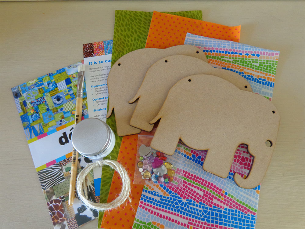 3 x 15CM elephant shapes (MDF), a mixed pack of paper (equalling 1 full sheet), jewels, 1 x decopatch brush, a small pot of decopatch glue and jute for hanging.