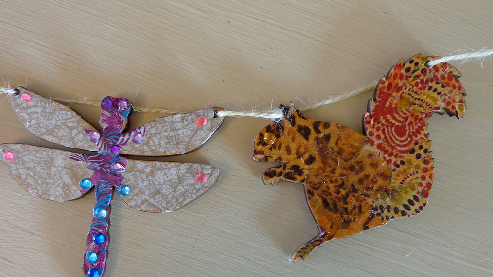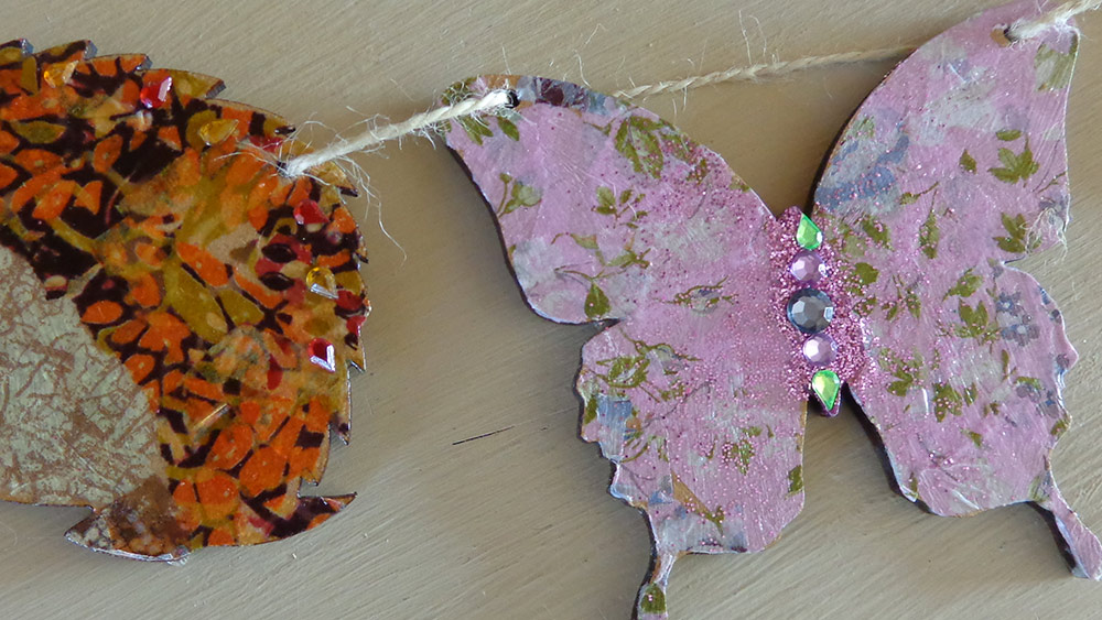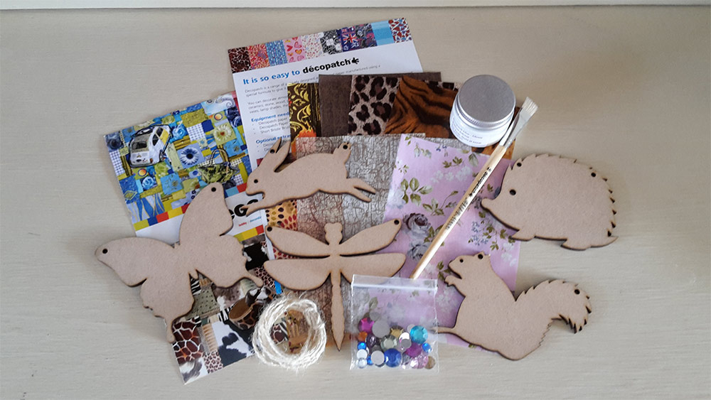 5 shapes (MDF), a small mixed pack of paper (equalling 1 full sheet), jewels, 1 decopatch brush, a small pot of deco patch glue and a jute for hanging.