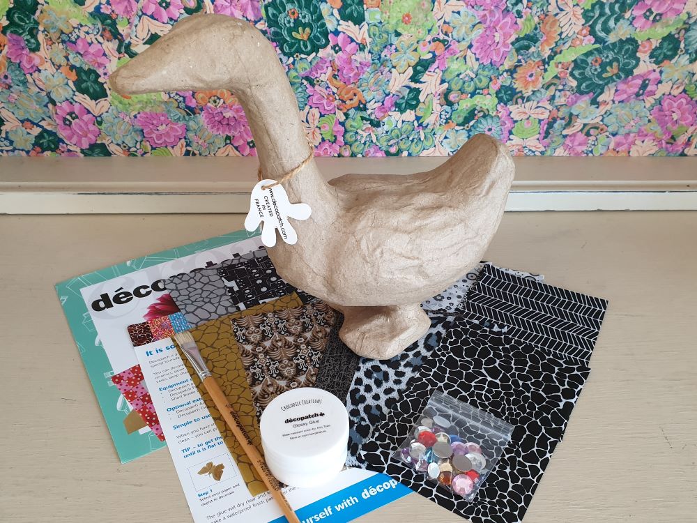Papier mache Goose SA139 (24cm x 10.7cm x 21cm), 3 half sheets of Decopatch paper, Decopatch Glue, Decopatch brush and mixed jewels.