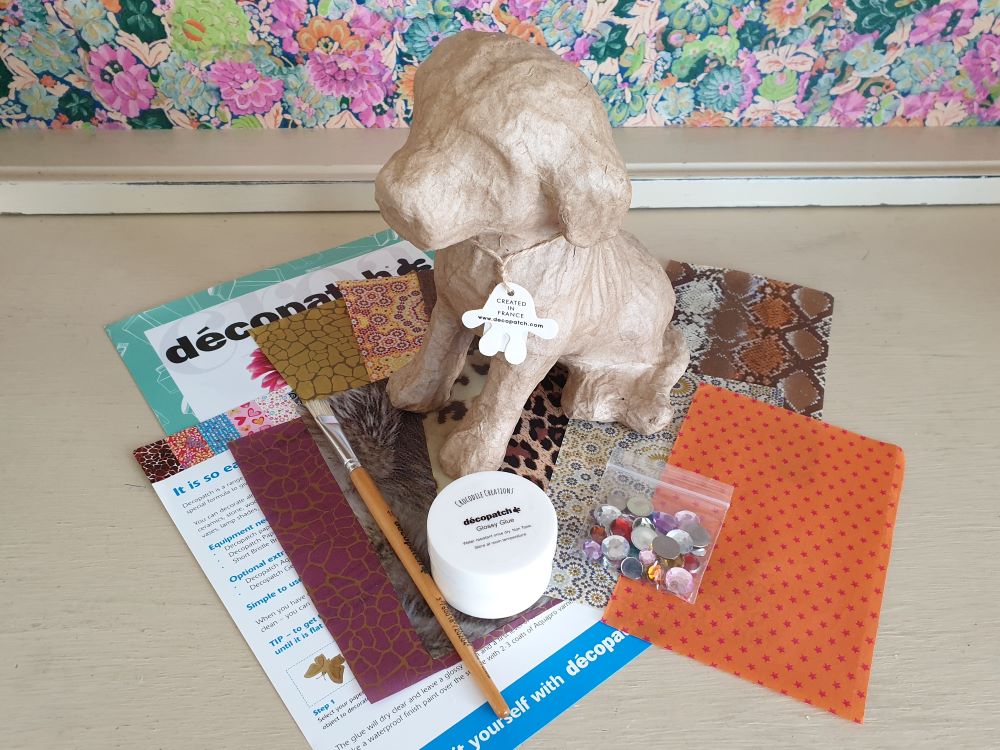 Papier mache Sitting Dog SA111 (15cm x 13cm x 18cm), 3 half sheets of Decopatch paper, Decopatch Glue, Decopatch brush and mixed jewels.