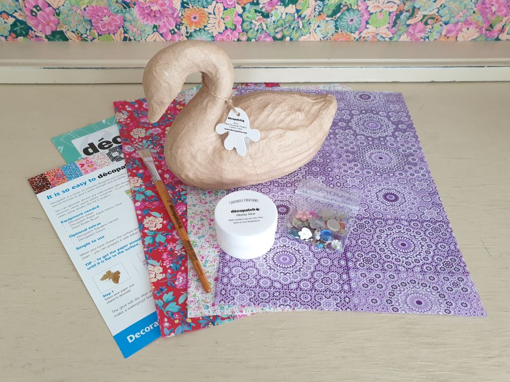 Papier mache Swan SA192 (14cm x 8cm x 14cm), 3 half sheets of Decopatch paper, Decopatch Glue, Decopatch brush and mixed jewels.