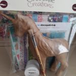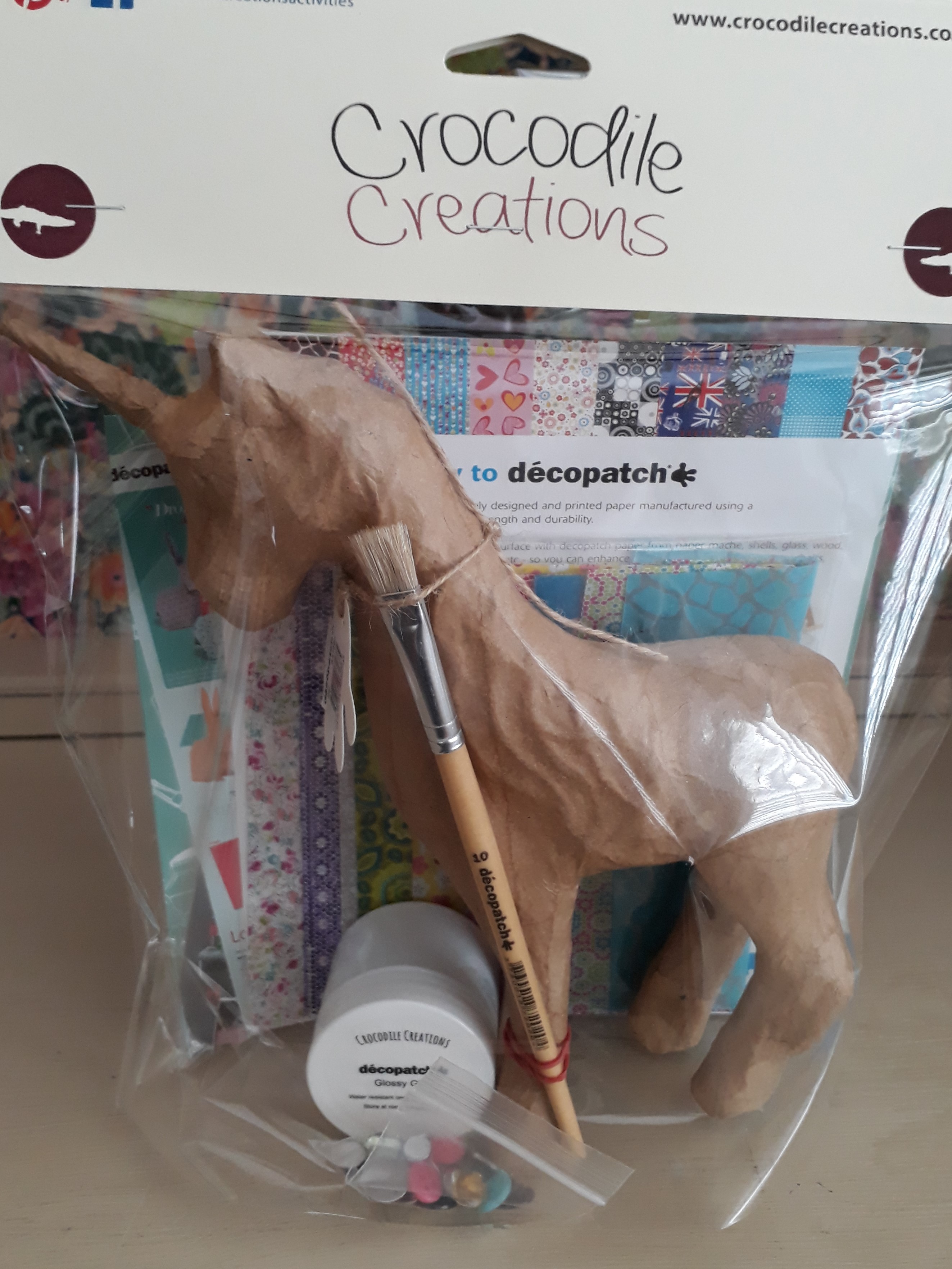 Papier mache unicorn SA168 (16cm x 21cm), 1.5 sheets of Decopatch paper, Decopatch Glue, Decopatch brush and mixed jewels.