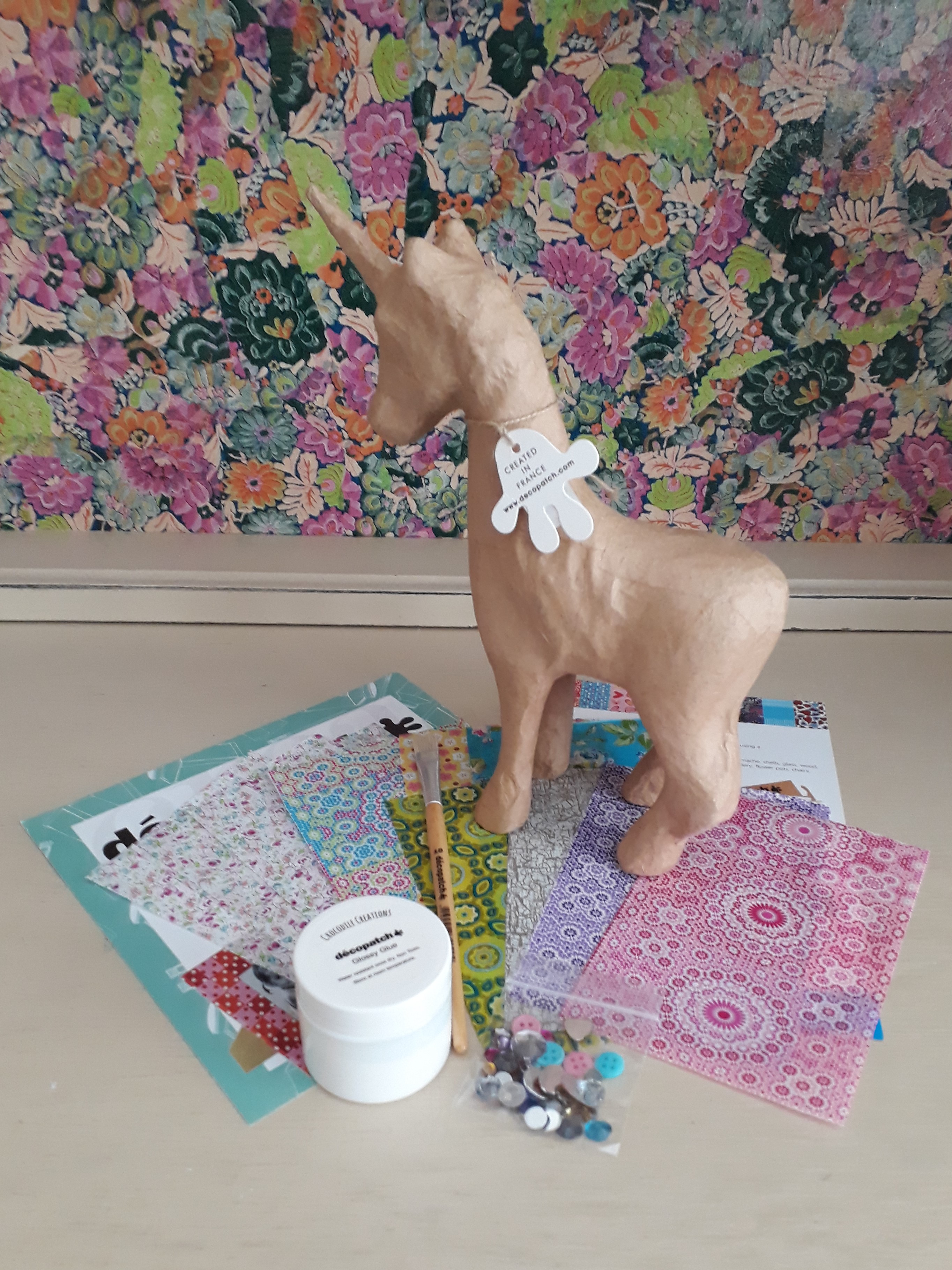 Papier mache unicorn SA168 (16cm x 21cm), 1.5 sheets of Decopatch paper, Decopatch Glue, Decopatch brush and mixed jewels.