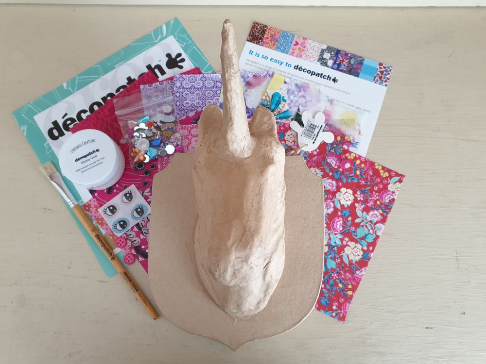Papier mache Unicorn Head SA180o (18cm x 15.5cm x 21cm), 3 half sheets of Decopatch paper, Decopatch Glue, Decopatch brush and mixed jewels.