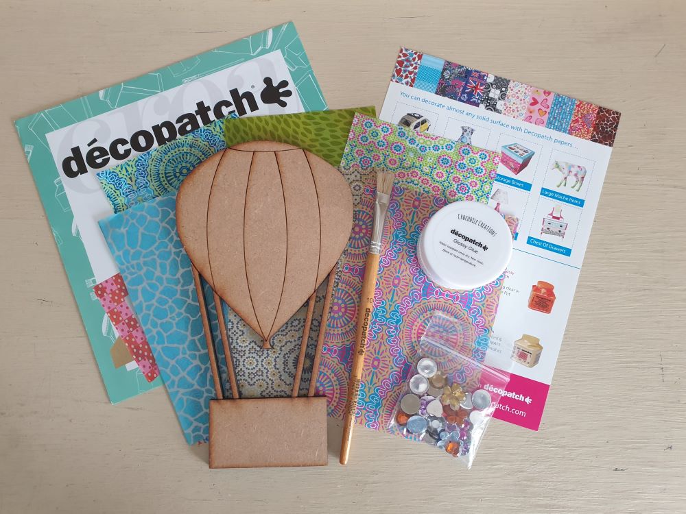 1 x 20cm balloon shape (MDF), 6 small sheets of decopatch paper (equalling 3/4 of a full decopatch sheet), 1 x decopatch brush, jewels and a small pot of  decopatch glue.