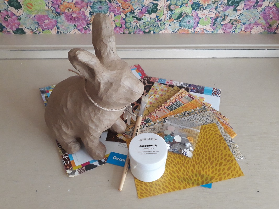 Papier mache bunny SA1450 (14.5cm x 8 x 8.5cm), 1.5 sheets (12 x small pieces) of Decopatch paper, Decopatch Glue, Decopatch brush and mixed jewels.