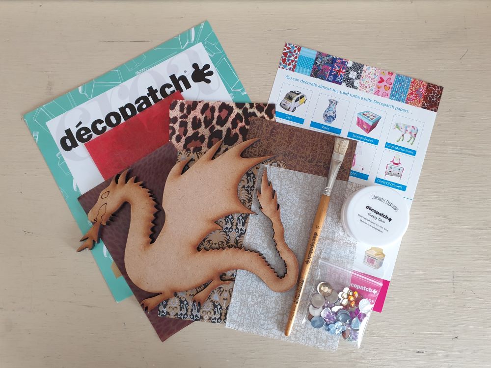 1 x 20cm dragon shape (MDF), 6 small sheets of decopatch paper (equalling 3/4 of a full decopatch sheet), 1 x decopatch brush, jewels and a small pot of decopatch glue.