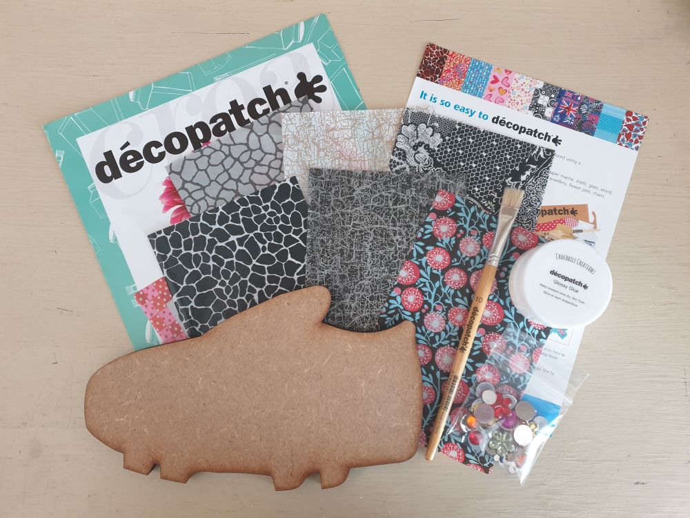 1 x 20cm football boot shape (MDF), mixed decopatch papers, 1 x decopatch brush, jewels and a small pot of decopatch glue.