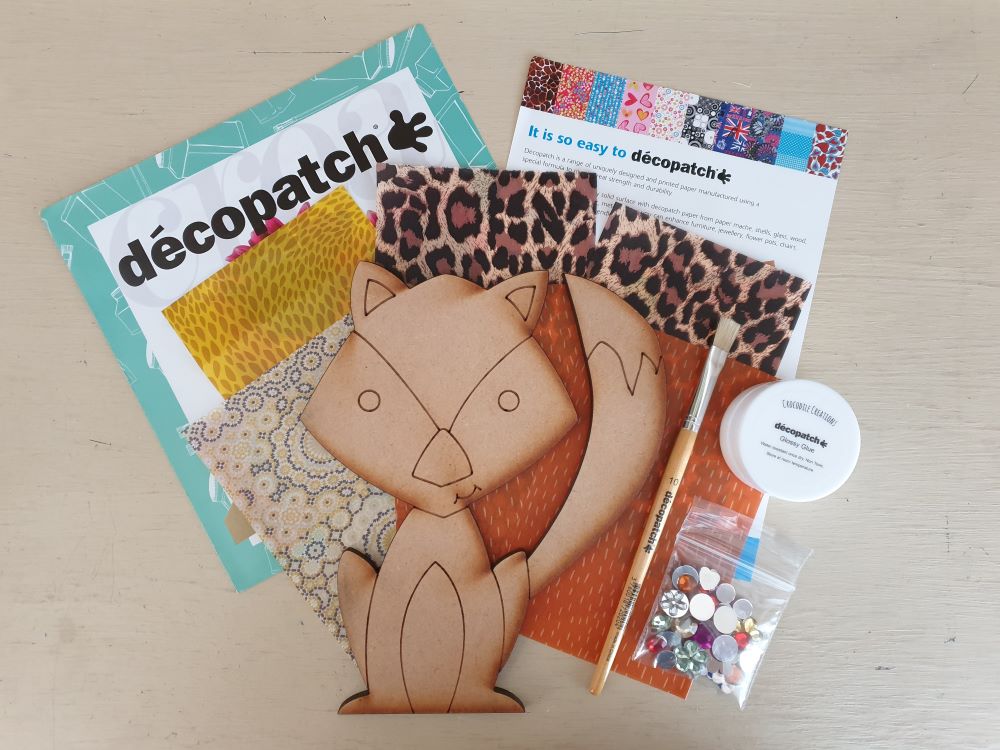 1 x 20cm Fox shape (MDF), 6 small sheets of decopatch paper (equalling 3/4 of a full decopatch sheet), 1 x decopatch brush, jewels and a small pot of  decopatch glue.