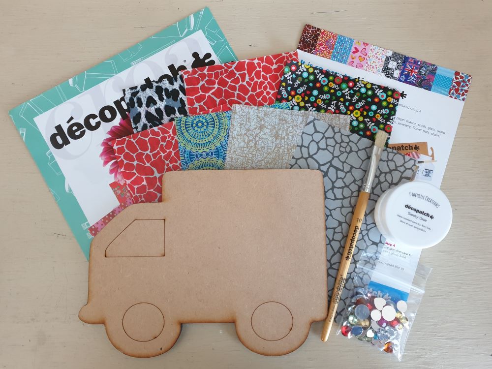 1 x 20cm lorry shape (MDF), 6 small sheets of decopatch paper (equalling 3/4 of a full decopatch sheet), 1 x decopatch brush, jewels and a small pot of decopatch glue.
