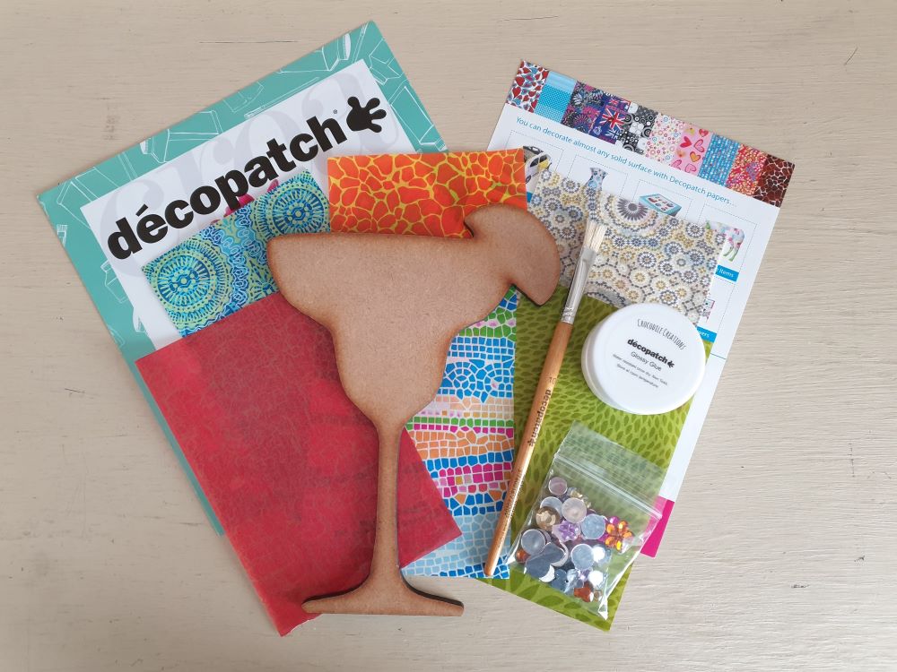 1 x 20cm margarita shape (MDF), 6 small sheets of decopatch paper (equalling 3/4 of a full decopatch sheet), 1 x decopatch brush,  jewels and a small pot of  decopatch glue.