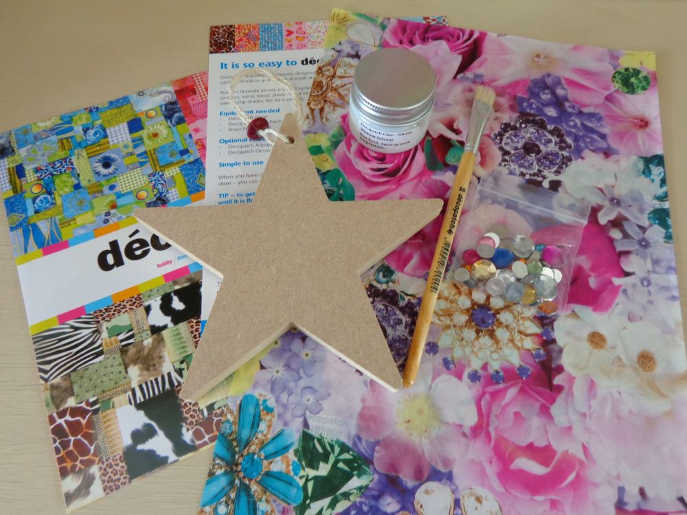 1 x 15 cm star (MDF), 6 small sheets of decopatch paper (equalling 3/4 of a full sheet decopatch paper), 1 x decopatch brush, jewels and a small pot of decopatch glue.