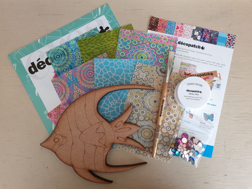 1 x 20cm x 16.5cm tropical fish shape (MDF), 6 small sheets of decopatch paper (equalling 3/4 of a full decopatch sheet), 1 x decopatch brush, jewels and a small pot of decopatch glue.